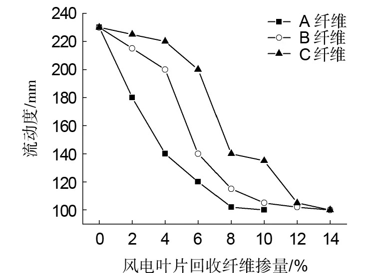 随着纤维掺量的增加,砂浆的流动度逐渐降低,其中,掺A纤维砂浆的流动度下降最快,掺C纤维砂浆的流动度下降最慢。